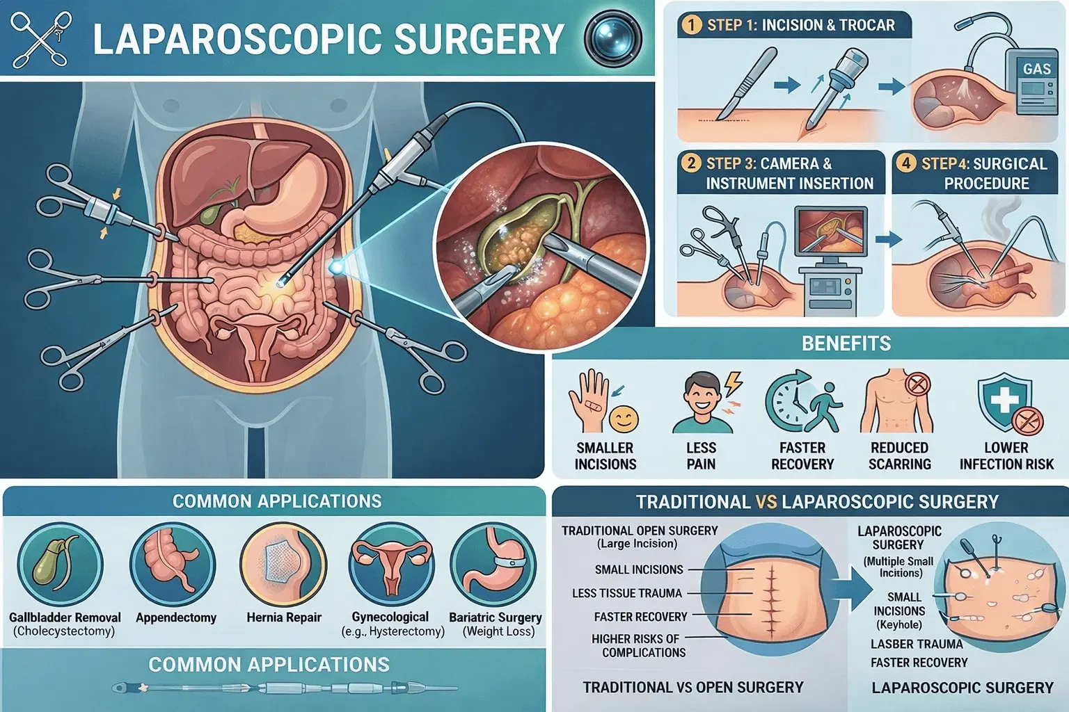 - ● Highly safe: Due to the low risks, laparoscopic surgeries are far more effective and safe than conventional ones. This is considering factors like the patient’s safety, the precision of the operation, recovery time, pain, patient comfort, etc.