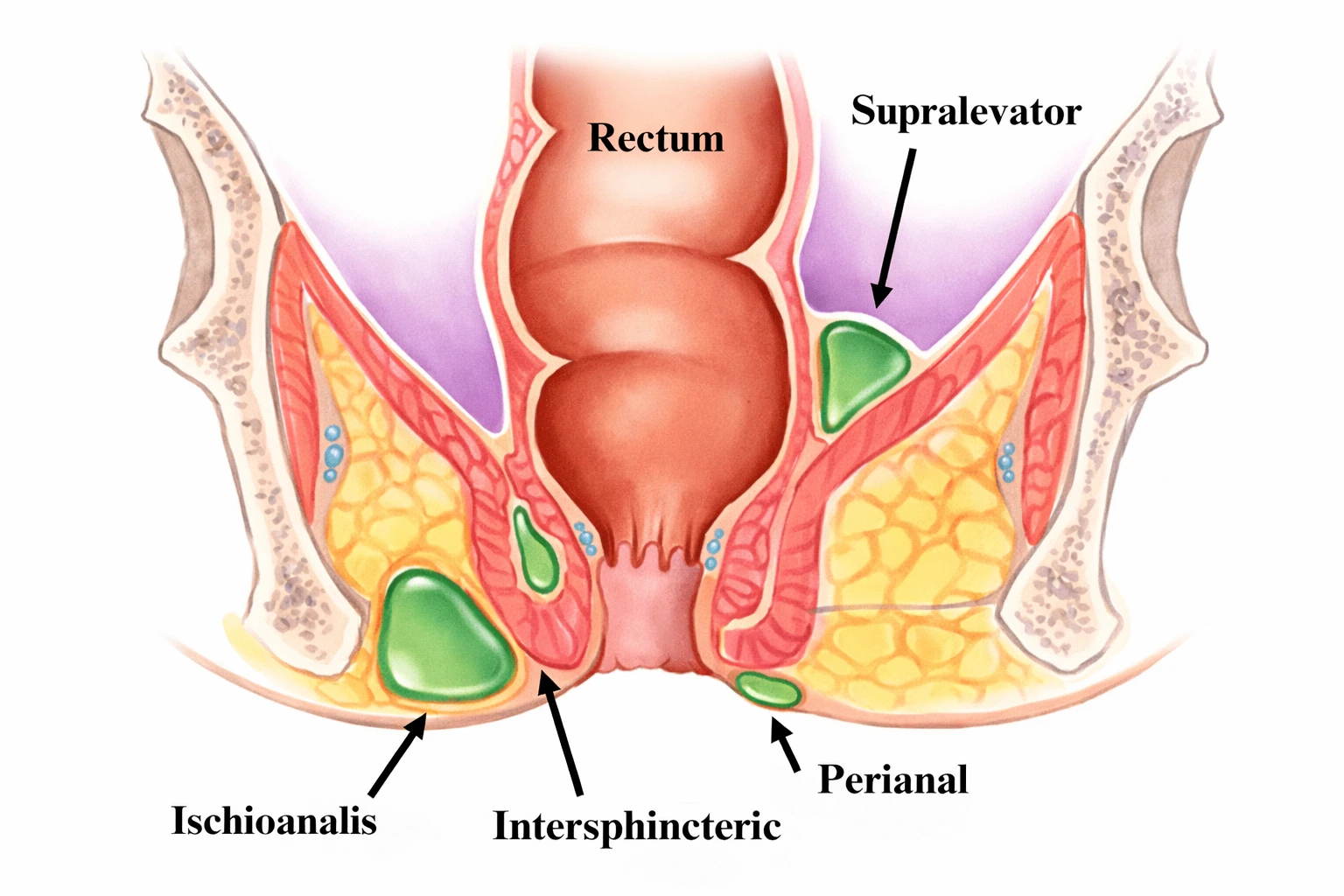 It is a common question to wonder ‘if an abscess can drain by itself at times, how to know when it is considered “serious” and requires treatments’? The answer lies in understanding what exactly is happening at the perianal abscess site. As can be seen from above, perianal abscesses are generally formed as superficial pus collection pockets. These can burst and drain out, and it feels like everything is returned to normal. But if the pores of the glands continue to be blocked, the infection returns. This cycle can happen multiple times. The spaces contiguous to the glands and anal regions normally contain a lot of adipose tissue—also called fat. Fat regions by nature are well known to have low blood circulation, and can easily be pushed around to accommodate other structures. This means that the pus-filled pocket can easily expand into the fat regions and form deeper pus pockets. Low blood circulation in the fat tissues allows for faster bacterial growth in these deeper pockets. The infection is not just a superficial infection anymore. This is when a perianal abscess becomes a ‘serious’ condition requiring immediate treatment.